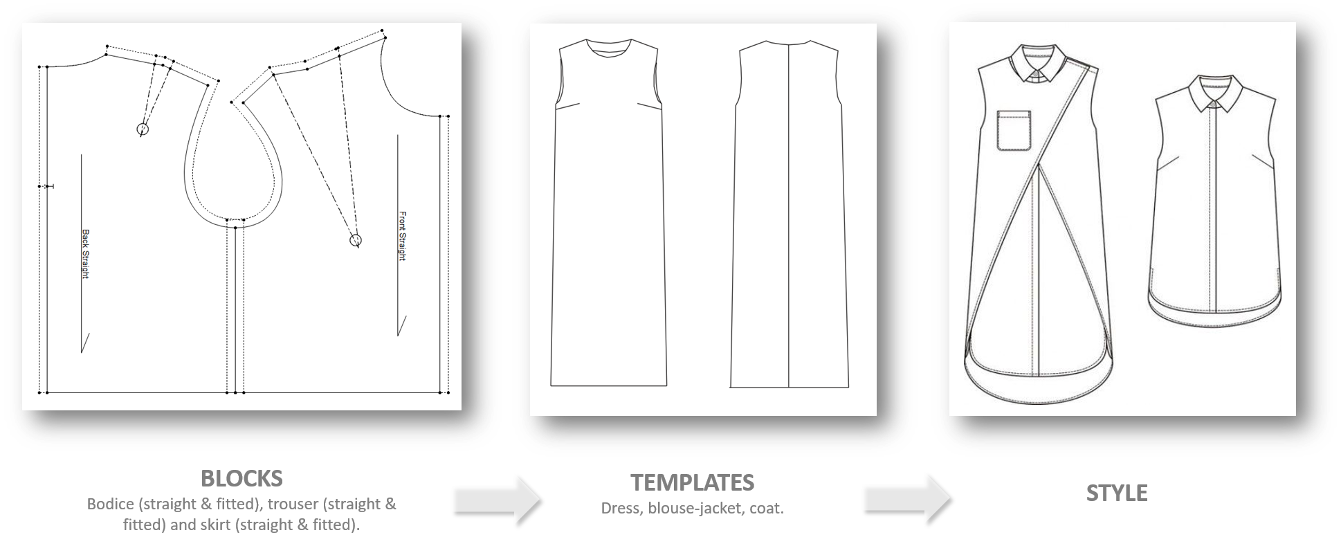 Instead of developing patterns and fit using vague body related information, we develop styles by transforming and manipulating features of pre-fitted basic shapes (blocks and templates). This approach allows us to not only be more efficient and waste less in the process but also ensures that garments always fit perfectly in a consistent and reliable manner.